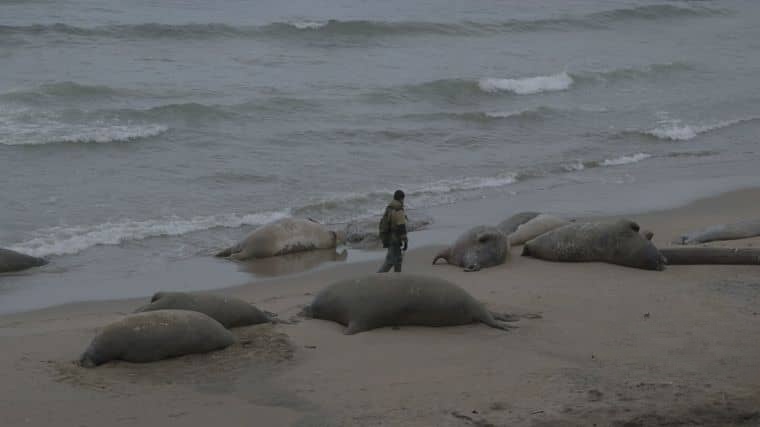 中段用长镜头记录海象的“生存挣扎”:成年雄象为争夺空间用獠牙互相推搡,幼象在缝隙中钻行寻找母亲,海浪拍打时整个群体因恐慌而骚动,导致更多个体被踩踏。影片没有刻意渲染血腥,却通过细节传递绝望:一只幼象被压在成年海象身下,鼻子无力地摆动;退潮后,查基列夫在沙滩上用木棍拨开尸体,每具尸体上都有深浅不一的伤痕,他在笔记本上记录数字,镜头特写本子上逐年递增的死亡统计(2018年57头,2021年132头)。