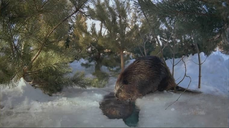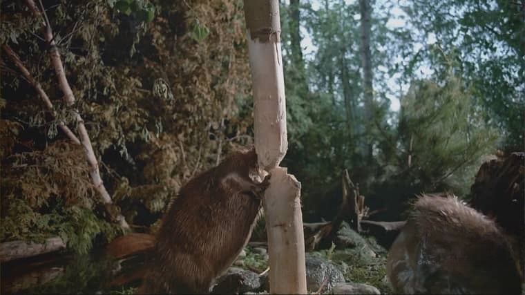 作为1988年的IMAX代表作,影片用70毫米胶片拍摄的画面极具震撼力:从高空俯瞰海狸水坝如“银色丝带”缠绕森林,到水下特写海狸用爪子梳理防水毛发,细节清晰到能看见“啃树时飞溅的木屑”和“幼崽鼻子上的水珠”。旁白以“童话般的语调”讲述海狸故事,却不失科学严谨——解释它们的牙齿结构(珐琅质含铁,呈橘色,异常坚硬)、尾巴功能(平衡、通讯、脂肪储存),让观众在赞叹“可爱”的同时,理解“海狸对生态系统的关键作用”。正如影片结尾所说:“它们用牙齿和爪子改变世界,不是为了征服,而是为了生存——这或许是大自然给人类的小小启示。”
