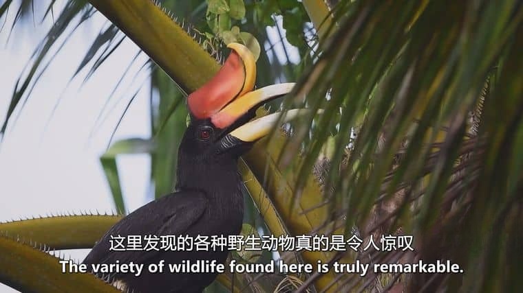 影片开篇跟随Cede深入京那峇当岸河上游,这里是“雨林与河流的交响”:树冠层的 Rhinoceros Hornbill(犀鸟)用长达90厘米的喙啄食无花果,果实种子随粪便落入河流,被鱼类吞食后带到下游,生根发芽;而长鼻猴(Proboscis Monkey)每天清晨从红树林出发,逆流而上到雨林觅食,其特殊的消化系统能分解有毒树叶,排泄物则成为河虾的食物。这种“雨林-河流-海洋”的物质循环,在入海口达到顶峰——河流携带的营养物质滋养了苏禄海的珊瑚礁,礁区生活着300多种珊瑚和1200种鱼类,形成“水下热带雨林”。Cede在片中展示他拍摄的“食物链瞬间”:咸水鳄潜伏在红树林根系中,突袭前来饮水的野猪;而虎鲨则在河口等待逆流而上的鲑鱼,“这条河就像一条输送生命的血管,连接着陆地与海洋的每一个角落。”