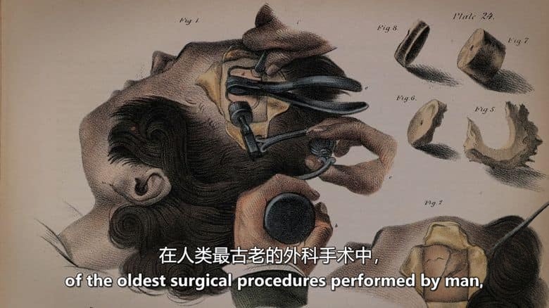 纪录片的叙事始于一处震撼的远古发现:一具拥有3000年历史的骨骼上,颅骨赫然带有一个规整的孔洞,这正是远古时期环钻术(颅骨钻孔手术)留下的明确证据,印证了外科手术的雏形早在数千年前就已出现,为整部影片的历史回溯奠定了起点,也抛出了核心命题——外科手术是如何从原始、简陋的操作,逐步发展为一门严谨、复杂的现代科学的?