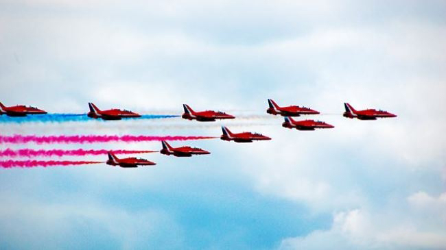 纪录片的结尾,镜头跟随 “红箭” 完成一场在伦敦上空的表演 —— 九架红色飞机掠过泰晤士河,在白金汉宫上空拉出红、白、蓝三色烟带(英国国旗配色),地面上的观众发出阵阵欢呼。这一刻,“红箭” 不再只是一支飞行表演队,更成为英国民众的 “情感寄托”。