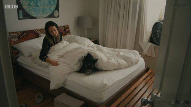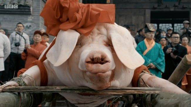 旁白以反复的诘问“我们爱猪,却又吃掉它”强化了主题的矛盾性,引导观众反思自身的消费行为与道德立场。结尾回归中国实验室,展示了一种名为“迷你猪”的科研成果,这种小型猪被用于医学实验,以减少对大型猪的需求,体现了科技进步在伦理问题上的潜在解决方案。
