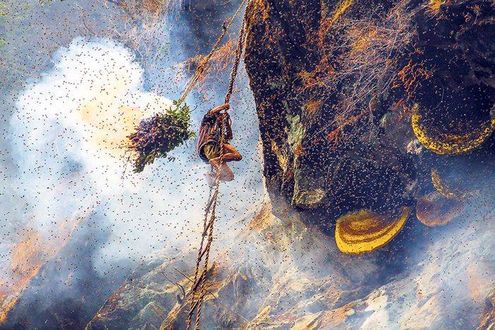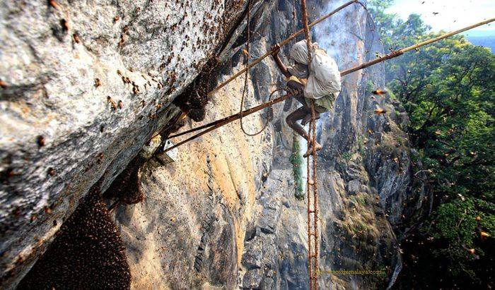 喜马拉雅山脉深处的独特生态,为野生蜜蜂提供了理想的栖息环境 —— 它们在数百米高的悬崖岩石缝隙中筑造巨大蜂箱,产出的蜂蜜因富含高山植物精华而珍贵。但这份 “自然馈赠” 的获取之路却布满凶险:悬崖几乎垂直,仅靠当地采蜜人手工编织的粗麻绳梯作为唯一支撑;蜂箱周围聚集着数千只具有攻击性的野蜂,一旦防护不当便会遭到密集攻击;山间多变的天气(如突如其来的阵风、浓雾)更增加了作业风险,稍有不慎便可能坠入深渊。