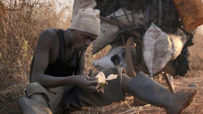 作为摄影师出身的导演,伊曼纽尔・嘉哈在影片中展现了出色的影像把控能力。他没有采用 “上帝视角” 的航拍或刻意的特写,而是以 “平视” 的镜头语言,与马加拉保持着恰当的距离 —— 既不会因过于贴近而干扰马加拉的正常生活,也不会因距离过远而失去真实感。影片的画面充满质感:丛林中透过树叶的阳光、炭窑中跳动的火焰、公路上飞扬的尘土,都被细腻地捕捉下来,形成强烈的视觉冲击;尤其是夜间场景,马加拉在昏暗的煤油灯下整理木炭,灯光在他脸上投下斑驳的光影,既凸显了环境的简陋,也勾勒出他坚毅的轮廓。