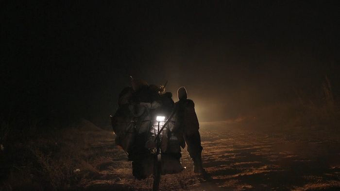“只有一辆单车,载满一袋袋沉甸甸的木炭,他一个人推着上路,长途跋涉,期望送到镇上能卖个好价钱”—— 如果说丛林制炭考验的是马加拉的体力与意志,那么公路卖炭则让他直面人情凉薄的现实。镜头跟随马加拉的单车,踏上了前往镇上的崎岖道路:单车两侧挂满了用麻袋包裹的木炭,总重量远超马加拉的体重,他只能弯腰弓背,一手扶着车把,一手撑着地面,缓慢地向前推行;遇到上坡路段,他需将单车停靠在路边,用石块抵住车轮,再用肩膀顶住车身,一步一步向上挪动,甚至偶尔需要跪在地上发力,膝盖与路面的摩擦留下清晰的痕迹。