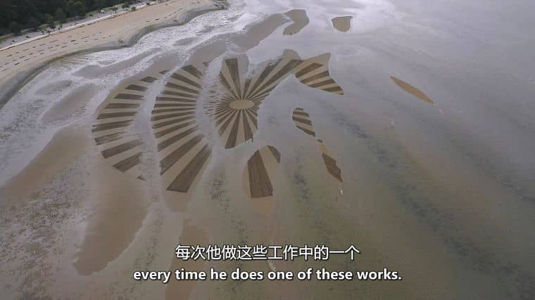 纪录片的开篇,便将观众带入吉姆・德尼文的土地艺术世界。镜头缓缓扫过开阔的田野、静谧的海岸 —— 这些看似平凡的自然场景,在他的手中却成为了巨大的 “画布”。他手持简单的工具,在广袤的土地上勾勒出精准而复杂的几何图案:有时是螺旋状的线条在麦田里延伸,如同大地跳动的脉搏;有时是对称的几何图形在沙滩上铺开,与海浪的起伏相映成趣。纪录片通过特写镜头,捕捉他创作时的专注:弯腰、丈量、刻画,每一个动作都充满了对自然的敬畏与对艺术的执着。他的土地艺术并非永久性的作品,随着季节的更替、风雨的侵蚀,这些图案会逐渐消逝,但正是这种 “短暂性”,让作品更具生命力 —— 它与自然共生,也随自然变迁,如同一场与时光对话的艺术仪式。正如吉姆在镜头前所说:“自然本身就是最伟大的艺术家,我只是用我的方式,让它的美以另一种形态呈现。”