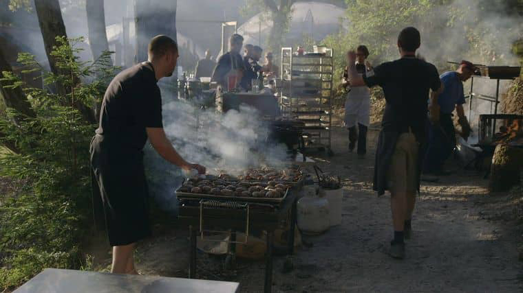 这场晚宴更像是一场艺术与生活融合的盛宴。吉姆不仅是组织者,更是 “美食艺术家”—— 他亲自参与菜单的设计,注重食材的本味,用简单的烹饪方式激发食材最纯粹的口感。纪录片中,有这样一段令人垂涎的场景:厨师现场烤制刚捕捞的海鱼,油脂在炭火上滋滋作响,香气弥漫在田野间;旁边的餐桌上,新鲜的蔬菜沙拉搭配自制的酱汁,色彩鲜艳,让人食欲大开。而最动人的,并非仅仅是美食本身,而是食客们的反应:有人品尝到久违的家乡味道,眼眶泛红;有人与陌生人因对美食的热爱而畅谈甚欢;孩子们在田野间奔跑嬉戏,笑声与美食的香气交织在一起。这一刻,食物不再只是果腹的工具,而是连接人与自然、人与人之间的纽带。