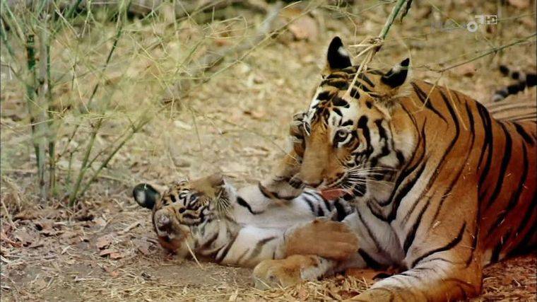 恒河平原的“母性课堂”:母虎“希拉”带着两只幼崽学习生存技能——爬树躲避亚洲象,用气味标记树干,甚至模仿野猪的叫声诱骗猎物。当幼崽因贪玩走失,希拉的呼唤声在森林中回荡两小时,最终用鼻子轻推它们的耳朵,将“调皮鬼”领回巢穴。