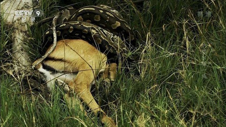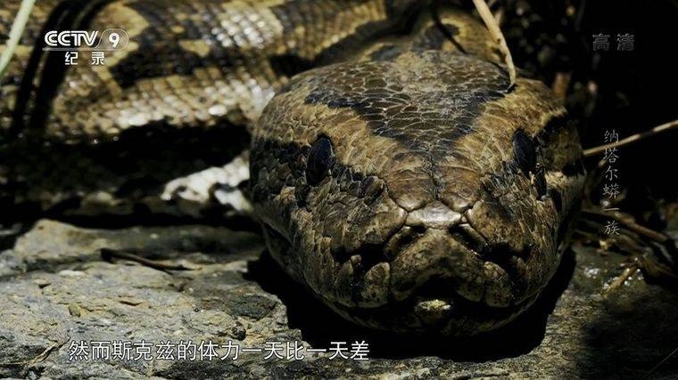 “闪电突袭”与“死亡缠绕”:当猎物进入攻击范围(通常1-2米),纳塔尔蟒会以0.2秒的速度弹出头部,用60颗向后弯曲的牙齿咬住猎物颈部,同时身体缠绕形成“活体绞索”。影片记录它绞杀成年疣猪的过程:每呼吸一次,蟒的缠绕力度就增加10%,3分钟内让猎物窒息,随后用可分离的下颌将整个猎物吞下(疣猪体重达30公斤,相当于蟒自身重量的一半)。