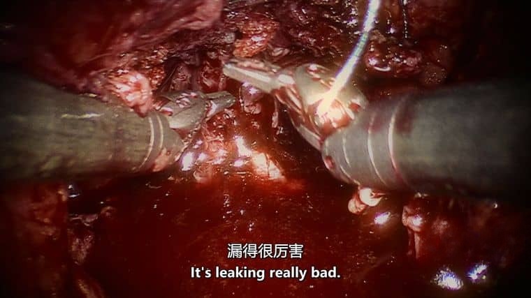 影片打破“医生全知全能”的刻板印象,捕捉手术室中真实而松弛的瞬间:脊柱侧弯矫正手术期间,器械突发故障,医生一边用扳手修理,一边吐槽设备“比老古董还难用”;前列腺手术中,主刀医生将内窥镜下的肠道形态比作“巴黎地铁迷宫”,与助手讨论沿线房价;护士在缝合伤口时哼着流行歌曲,麻醉师在监护仪旁刷手机——这些“不专业”的日常片段,消解了医疗场景的神秘感,还原了医护人员作为普通人的疲惫与幽默。同时,影片也记录了医学的脆弱性:抢救室外家属的焦虑等待、手术失败后医生沉默的背影、解剖室里遗体捐赠者的标签,展现了“生与死”在医院空间的交织。